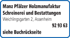 Die Adresse von Manz Pfälzer Holzmanufaktur lautet: Weichlingsgarten 2, 67126 Assenheim