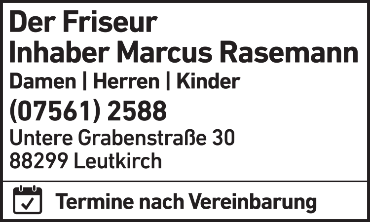Die Adresse von Marcus Rasemann Der Friseur lautet: Untere Grabenstr. 30, 88299 Leutkirch