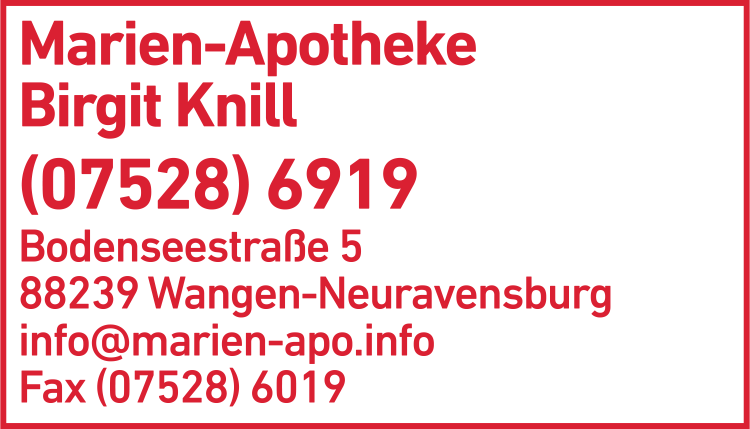 Die Adresse von Marien-Apotheke Inh. Birgit Knill lautet: Bodenseestr. 5, 88239 Wangen im Allgäu