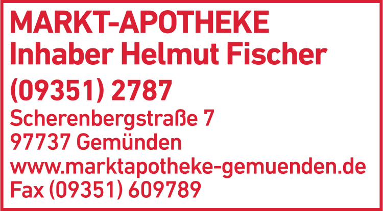Die Adresse von Markt-Apotheke Inh. Helmut Fischer lautet: Scherenbergstr. 7, 97737 Gemünden