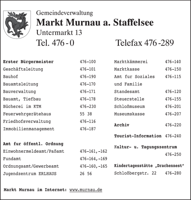 Die Adresse von Markt Murnau am Staffelsee lautet: Untermarkt 13, 82418 Murnau