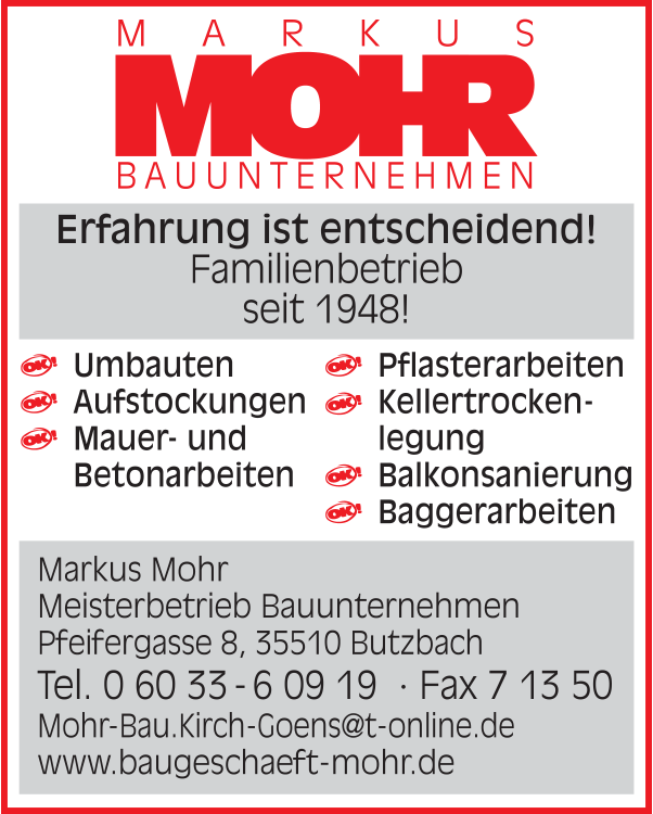 Die Adresse von Markus Mohr Bauunternehmen lautet: Pfeifergasse 8, 35510 Butzbach