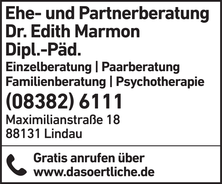 Marmon Edith Dr. Dipl. - Päd. Einzel- u. Familienberatung 08382 61 11 Lindau Maximilianstr. 18 88131 Insel