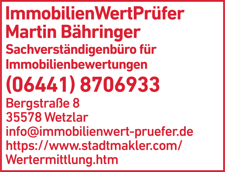 Die Adresse von Martin Bähringer ImmobilienWertPrüfer lautet: Bergstr. 8, 35576 Wetzlar