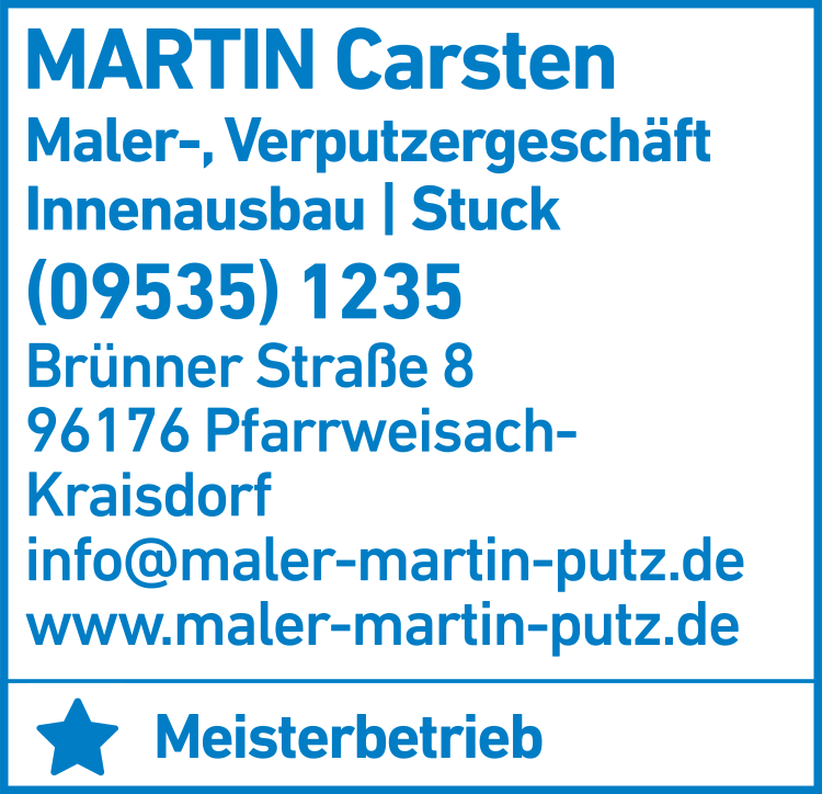 Die Adresse von Martin Carsten Maler- u. Verputzergeschäft lautet: Brünner Str. 8, 96176 Pfarrweisach-Kraisdorf