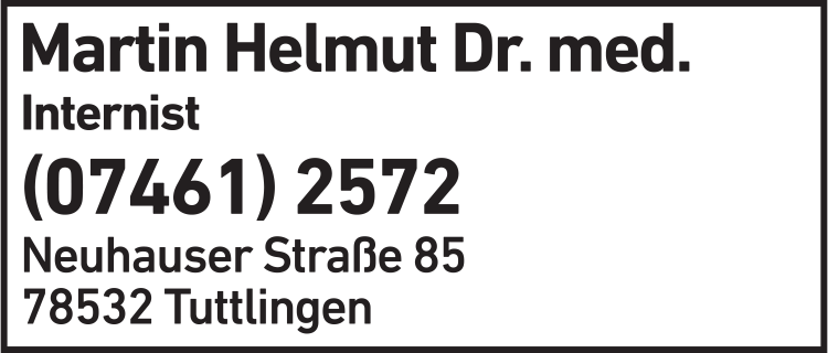Die Adresse von Martin Helmut Dr. med. Internist lautet: Neuhauser Str. 85, 78532 Tuttlingen