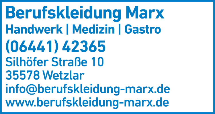 Die Adresse von Marx Berufskleidung lautet: Silhöfer Str. 10, 35578 Wetzlar