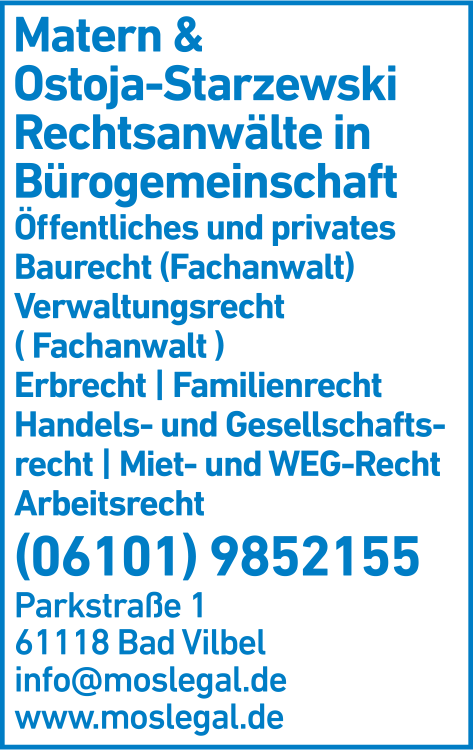 Die Adresse von Matern & Ostoja-Starzewski Rechtsanwälte in Bürogemeinschaft lautet: Parkstr. 1, 61118 Bad Vilbel