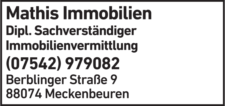 Die Adresse von Mathis Immobilienvermittlung lautet: Berblinger Str. 9, 88074 Meckenbeuren