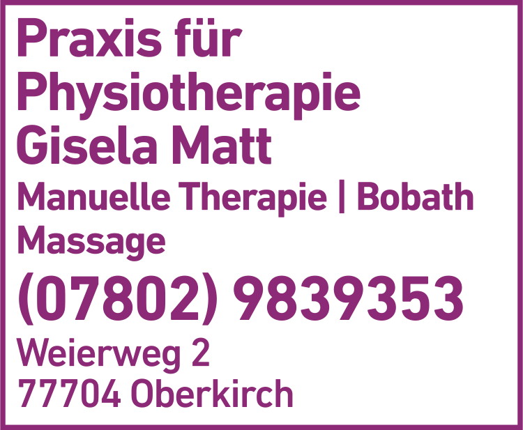 Die Adresse von Matt Gisela Physiotherapie lautet: Weierweg 2, 77704 Oberkirch