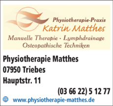 Die Adresse von Matthes Katrin Physiotherapie lautet: Hauptstr. 11, 07950 Triebes