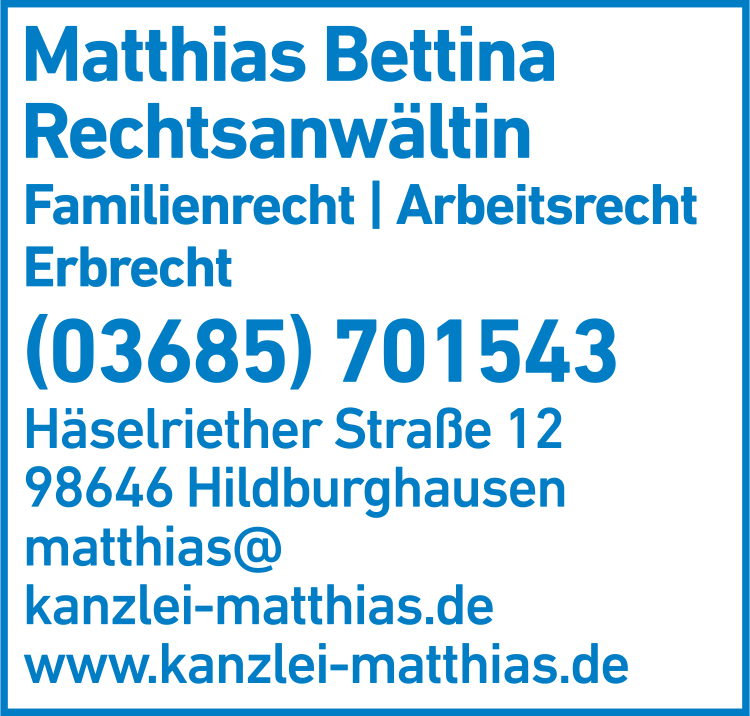 Die Adresse von Matthias Bettina Rechtsanwältin lautet: Häselriether Str. 12, 98646 Hildburghausen