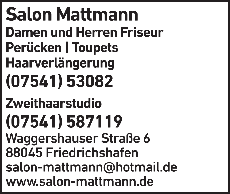 Die Adresse von Mattmann Marcel - Friseur & Zweithaarstudio Friseurgeschäft lautet: Waggershauser Str. 6, 88045 Friedrichshafen