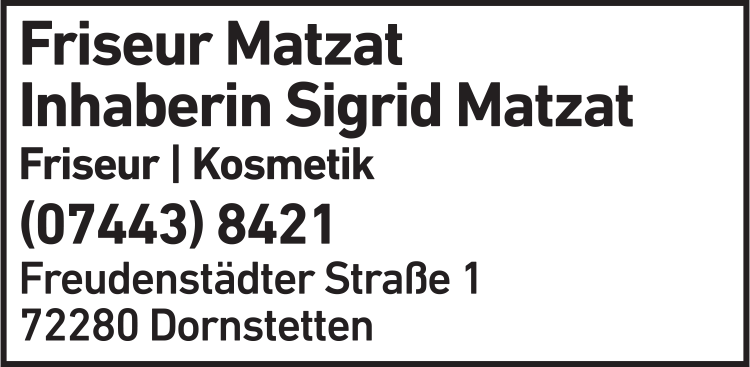Die Adresse von Matzat Sigrid La Biosthetique Salon lautet: Freudenstädter Str. 1, 72280 Dornstetten