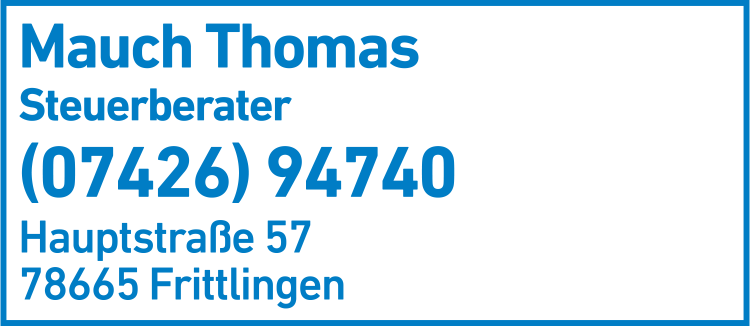 Die Adresse von Mauch Thomas Steuerberater lautet: Hauptstr. 57, 78665 Frittlingen