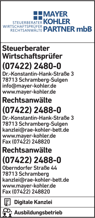 Die Adresse von Mayer Kohler + Partner mbB Steuerberater, Wirtschaftsprüfer und Rechtsanwälte lautet: Dr.-Konstantin-Hank-Str. 3, 78713 Schramberg