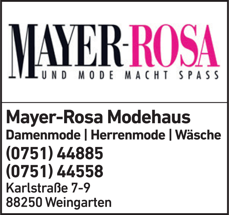 Die Adresse von Mayer-Rosa Adolf Modehaus lautet: Karlstr. 7-9, 88250 Weingarten