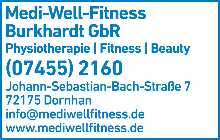 Die Adresse von Medi-Well-Fitness lautet: Johann-Sebastian-Bach-Str. 7, 72175 Dornhan