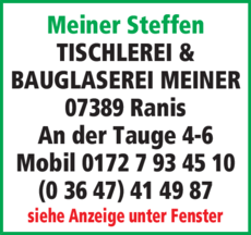 Die Adresse von Meiner Steffen lautet: An der Tauge 4-6, 07389 Ranis