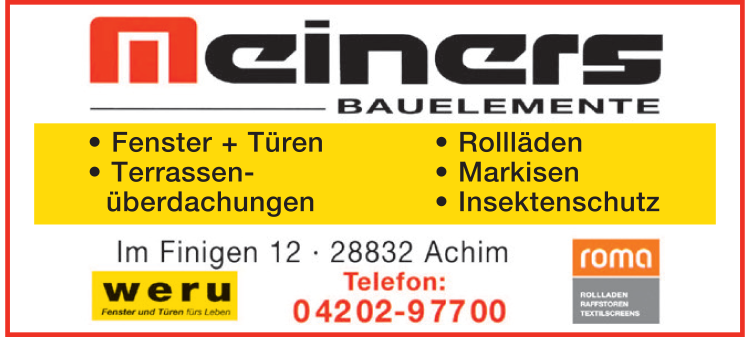 Die Adresse von Meiners WERU Fenster und Türen lautet: Im Finigen 12, 28832 Achim