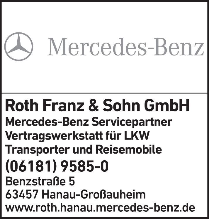 Mercedes Benz Franz Roth + Sohn GmbH Mercedes-Benz Servicepartner 06181 95 85-0 Hanau Benzstr. 5 63457 Großauheim