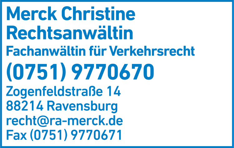 Die Adresse von Merck Christine Rechtsanwältin lautet: Zogenfeldstr. 14, 88214 Ravensburg