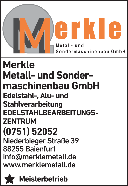 Die Adresse von Merkle Metall- und Sondermaschinenbau GmbH lautet: Niederbieger Str. 39, 88255 Baienfurt