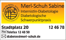 Merl-Schuh Sabine bietet Diabetes, Internistin, Zuckerkrankheit, Zucker, Diabetologie, Ärzte: Innere Medizin (Fachärzte), Diabetes Typ 1, Diabetes Typ 2, Diabetesschulung und Diabetologische Schwerpunktpraxis an.