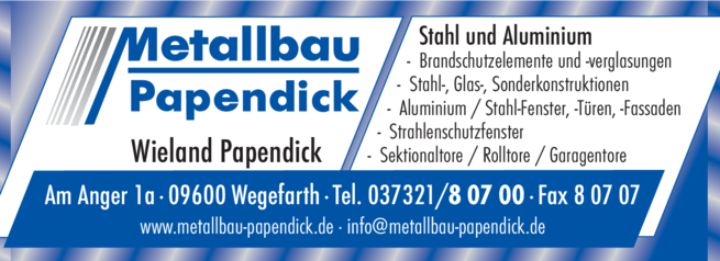 Die Adresse von Metallbau Papendick lautet: Am Anger 1 a, 09600 Wegefarth