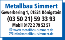 Die Adresse von Metallbau Simmert lautet: Gewerbering 1, 01824 Königstein