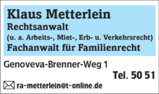 Metterlein Klaus bietet Fachanwalt für Familienrecht, Arbeitsrecht, Mietrecht, Erbrecht, Verkehrsrecht, Rechtsanwalt, Rechtsanwaltskanzlei, Rechtsanwälte, Familienrecht und Schadenersatzrecht an.
