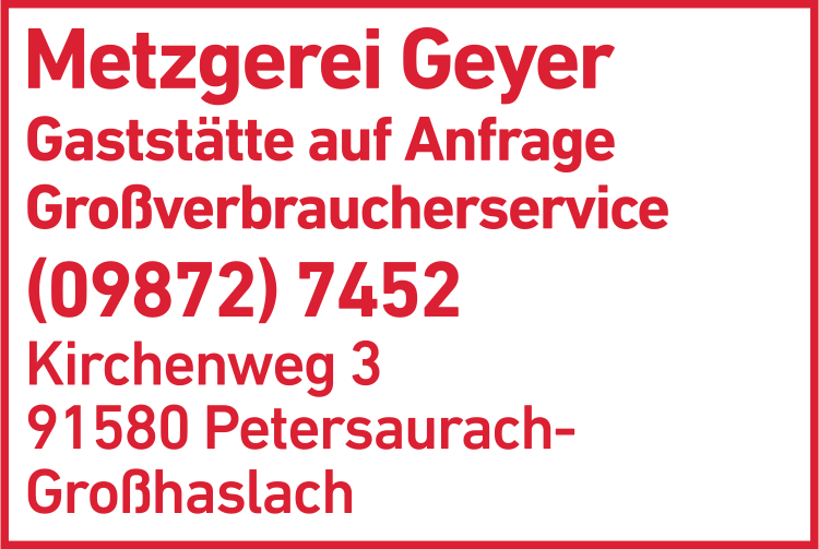 Metzgerei Geyer 09872 74 52 Petersaurach-Großhaslach Kirchenweg 3 91580 Großhaslach