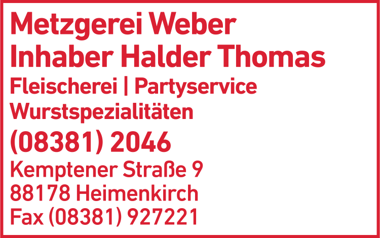 Die Adresse von Metzgerei Weber lautet: Kemptener Str. 9, 88178 Heimenkirch