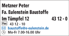 Metzner Peter hat montags bis freitags von 07:00 - 16:00 Uhr geöffnet.