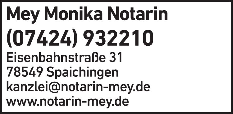 Die Adresse von Mey Monika Notarin lautet: Eisenbahnstr. 31, 78549 Spaichingen