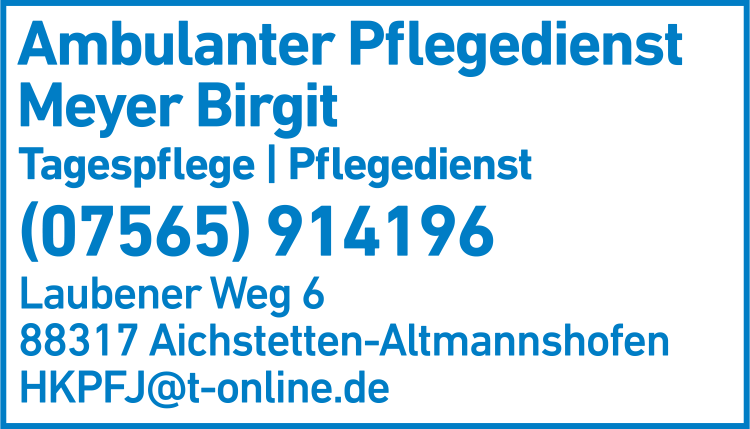 Die Adresse von Meyer Birgit Hauskrankenpflege lautet: Laubener Weg 6, 88317 Aichstetten