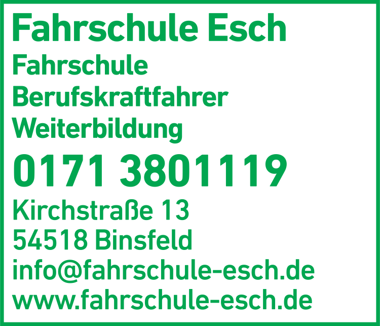 Die Adresse von Michael Esch Fahrschule lautet: Kirchstr. 13, 54518 Binsfeld