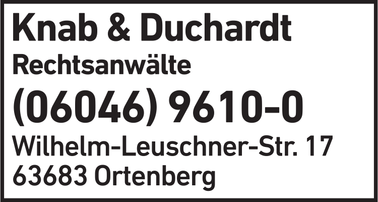 Die Adresse von Michael Knab & Christoph Duchardt GbR Rechtsanwälte lautet: Wilhelm-Leuschner-Str. 17, 63683 Ortenberg