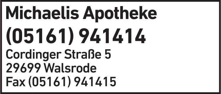 Die Adresse von Michaelis Apotheke lautet: Cordinger Str. 5, 29699 Walsrode