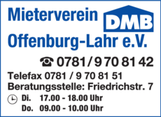 Mieterverein Offenburg-Lahr e.V. hat dienstags von 17:00 - 18:00 Uhr und donnerstags von 09:00 - 10:00 Uhr geöffnet.