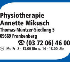 Die Adresse von Mikusch, Annette Physiotherapie lautet: Thomas-Müntzer-Siedlung 5, 09669 Frankenberg