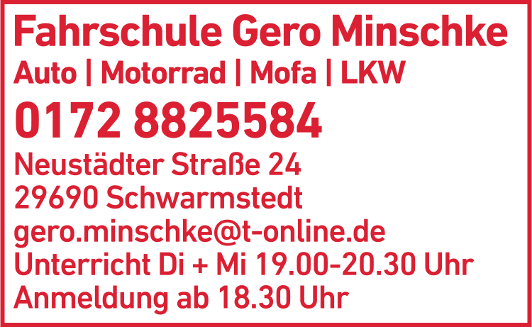 Die Adresse von Minschke Gero Fahrschule lautet: Neustädter Str. 24, 29690 Schwarmstedt