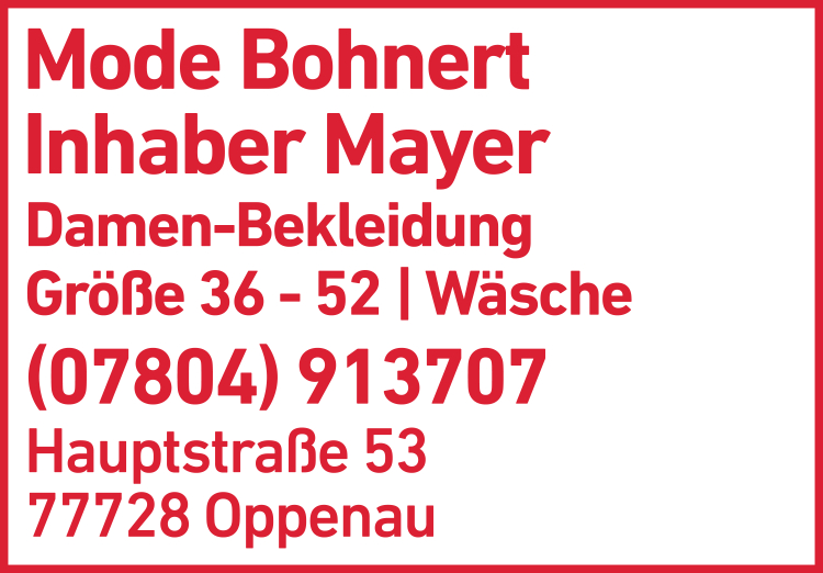 Die Adresse von Mode Bohnert lautet: Hauptstr. 53, 77728 Oppenau