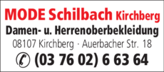 Die Adresse von Mode Schilbach lautet: Auerbacher Str. 18, 08107 Kirchberg