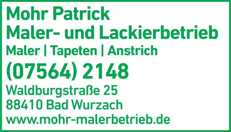 Die Adresse von Mohr Patrick Maler- u. Lackierbetrieb lautet: Waldburgstr. 25, 88410 Bad Wurzach