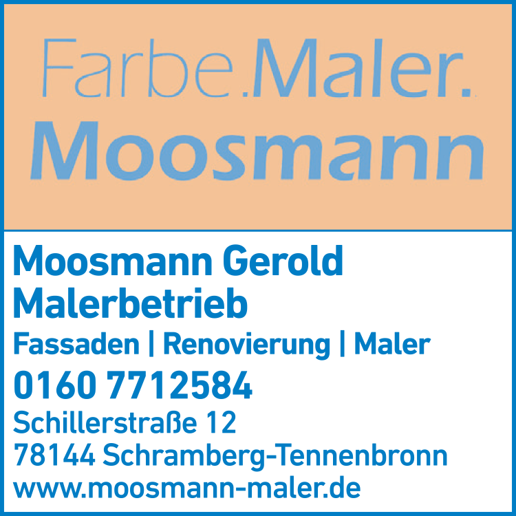 Die Adresse von Moosmann Gerold Malerbetrieb lautet: Schillerstr. 12, 78144 Schramberg-Tennenbronn