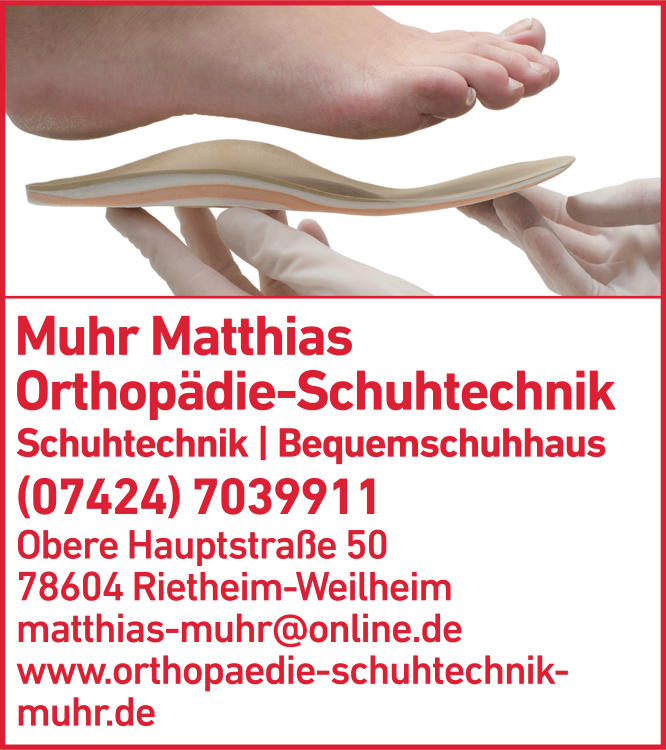 Die Adresse von Muhr Matthias Orthopädie-Schuhtechnik u. Bequemschuhhaus lautet: Obere Hauptstr. 50, 78604 Rietheim-Weilheim