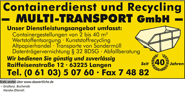 Multi Transport GmbH bietet Containerdienst, Containereildienst, Entsorgungsfachbetrieb, Gartenabfall, Grünschnitt, Sperrmüll, Baumischabfall, Mischabfall, Holz und Altholz an.