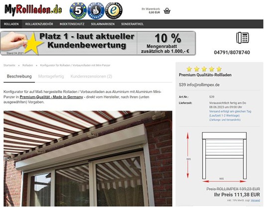 | <br>MyRollladen.de ist ein online Outlet-Store vom größten Rollladenhersteller im Elbe-Weser-Dreieck für Rollläden in Fachhandelsqualität. Sie erhalten Markenrollladen Made in Germany (Osterholz-Scharmbeck).Erster Absatzmarkt ist der gute Fachhandel oder der Tischler bei Ihnen vor Ort. Dort bekommen Sie unsere Rollladen inkl. Lieferung, Montage und viele weitere Dienstleistungen. |