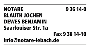 Die Adresse von NOTARE BLAUTH JOCHEN DEWES BENJAMIN lautet: Saarlouiser Str. 1 a, 66822 Lebach